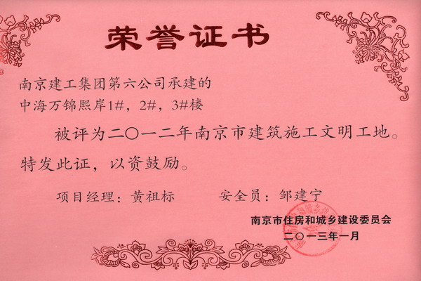 南京建工集團(tuán)六公司中海萬錦熙岸工程喜獲“市級文明工地” 近日,由南京建工集團(tuán)第六工程公司承建的中海萬錦熙岸項目1#、2#、3#樓主體工程喜獲“2012年南京市建筑施工文明工地”。