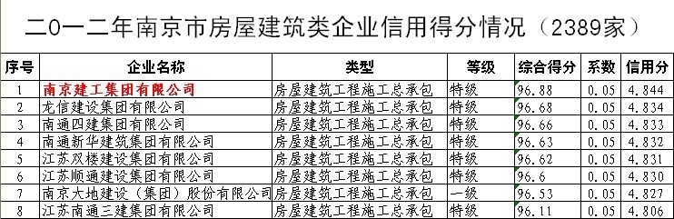 日前,在南京市建筑安裝管理處官網(wǎng)對“2012年南京市建筑業(yè)企業(yè)(房建類)信用評定結(jié)果”公示中,南京建工集團(tuán)有限公司從全市2389家(房建類)建筑企業(yè)中脫穎而出,綜合得分排名第一。