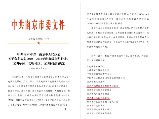 南京建工集團(tuán)喜獲2010-2012年度南京市文明單位近日,中共南京市委、南京市政府命名表彰2010-2012年度市級(jí)文明行業(yè)、文明單位、文明社區(qū)、文明村鎮(zhèn),南京建工集團(tuán)作為南京市住建系統(tǒng)僅有的兩家非公企業(yè)之一,榜上有名,這是對(duì)企業(yè)健康科學(xué)發(fā)展、文明創(chuàng)建成績的高度肯定。