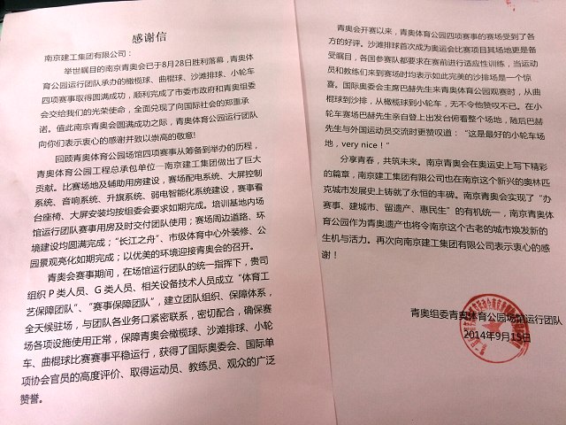 青奧專欄 ? 南京建工集團(tuán)青奧體育公園項(xiàng)目收到感謝信
