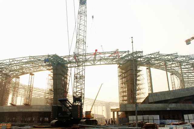 體育場項目鋼結(jié)構(gòu)吊裝難度大,技術(shù)要求較高。為此,項目部制定了周密的吊裝方案,確保了吊裝工對接作的順利進(jìn)行。吊裝期間,共動用3臺250噸履帶吊、1臺400噸履帶吊,同時施工,耗時兩個月,終于將體育場鋼結(jié)構(gòu)罩棚吊裝工程順利完成。 |