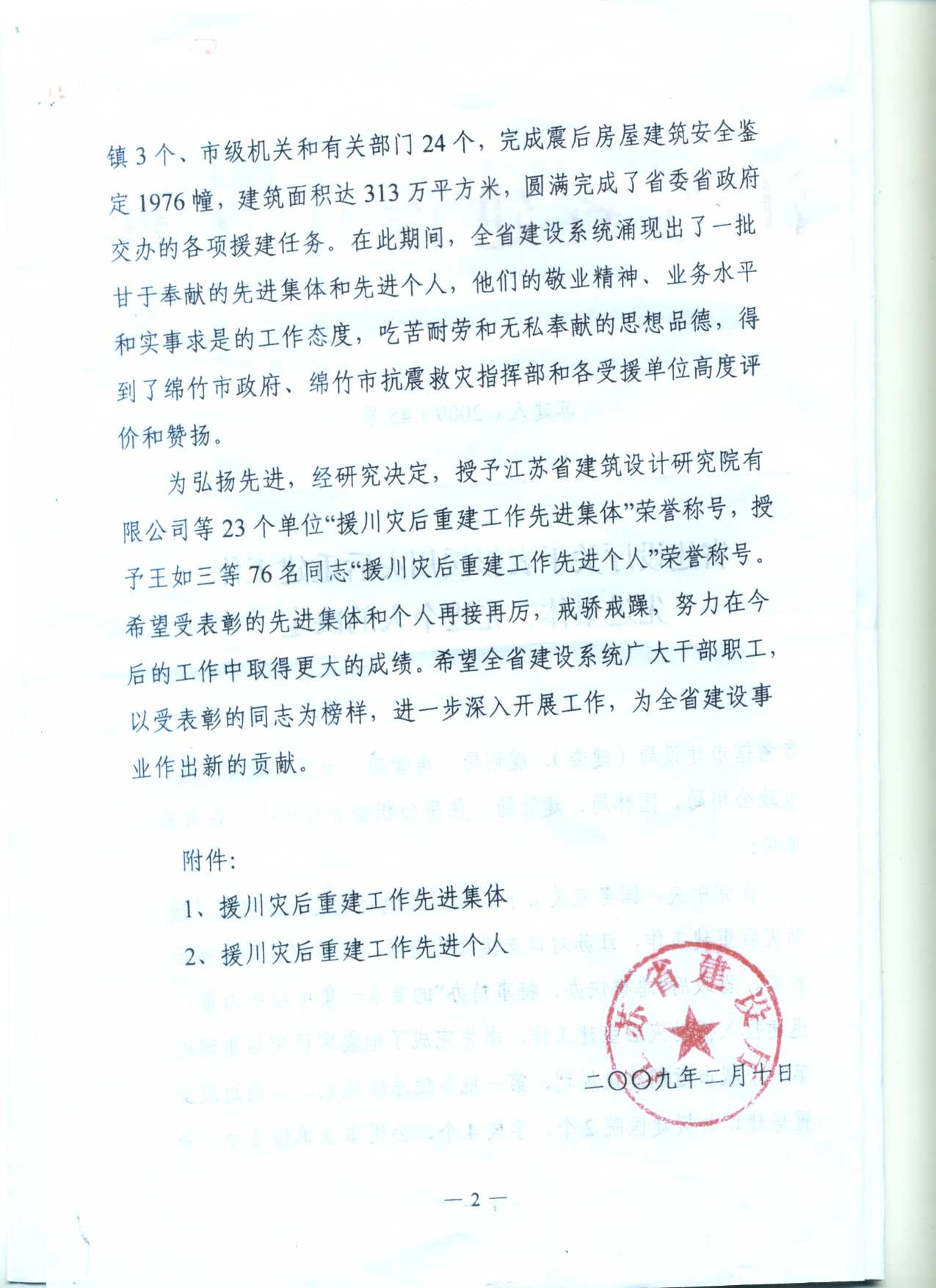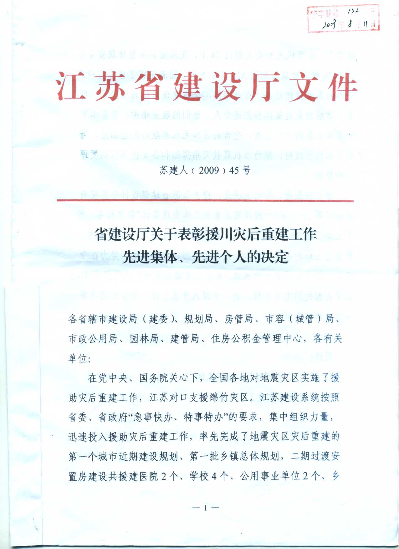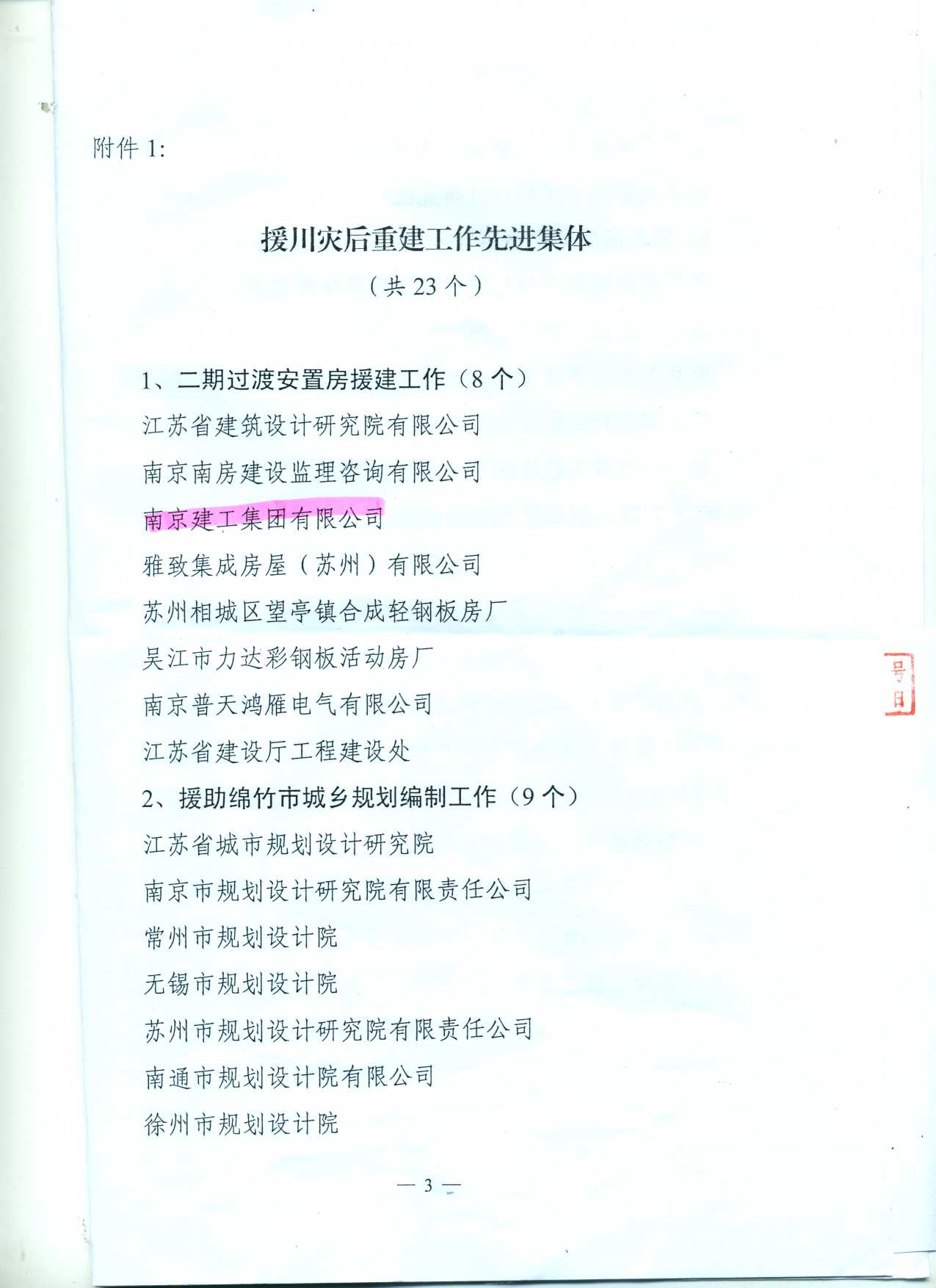 ? 南京建工集團被評為江蘇省建設(shè)廳“援川災(zāi)后重建工作先進集體”