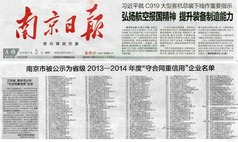 11月3日,《南京日報》刊載了南京市被公示為省級2013-2014年度“守合同重信用”企業(yè)名單。繼上年度榮膺此項殊榮后,南京建工集團有限公司再次榜上有名。